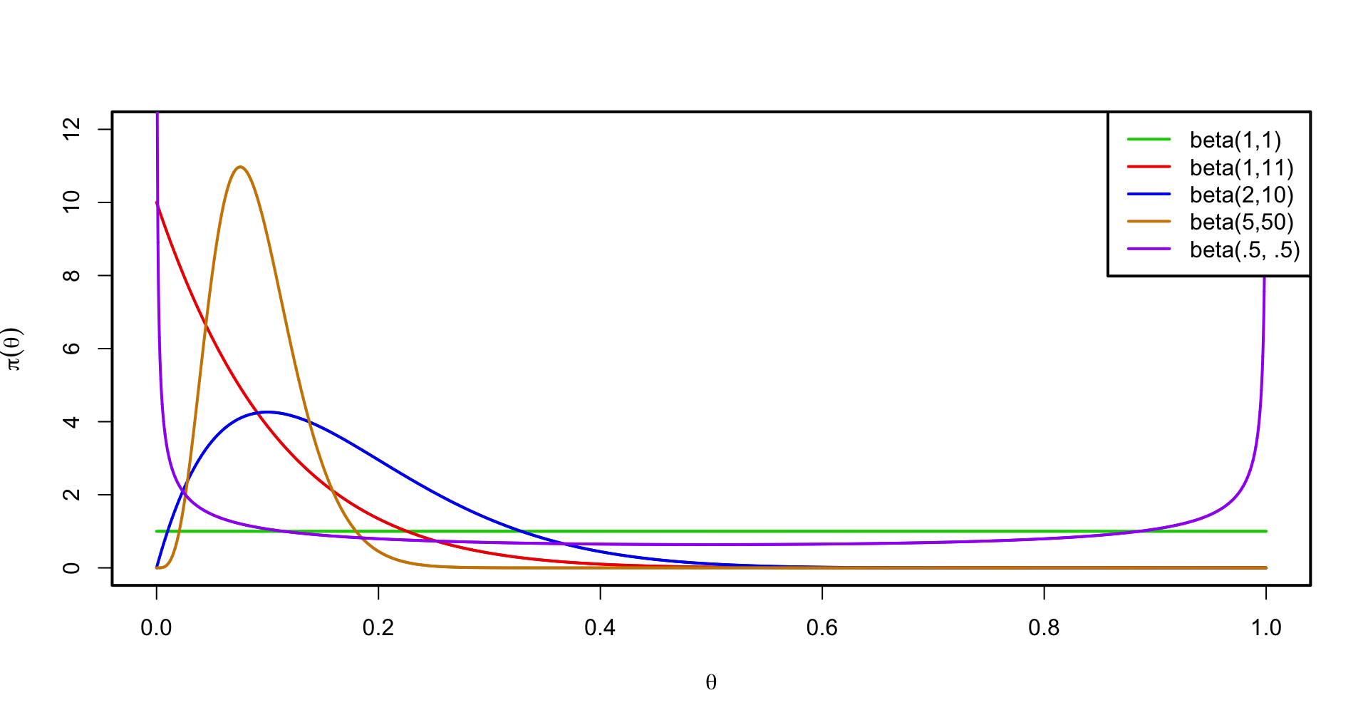 \[\pi(\theta) = \frac{1}{B(a,b)} \theta^{a-1} (1-\theta)^{b -1}\]