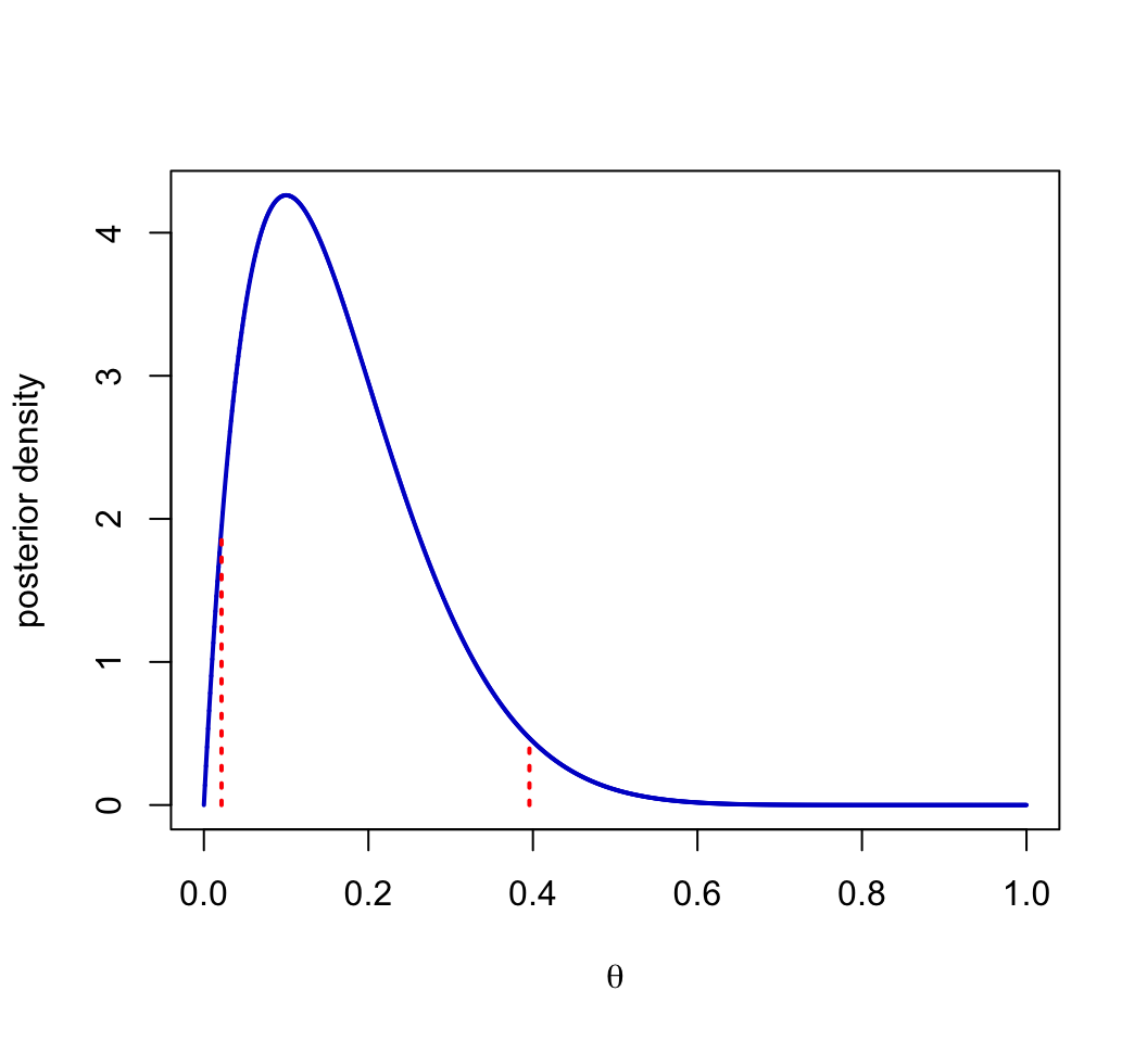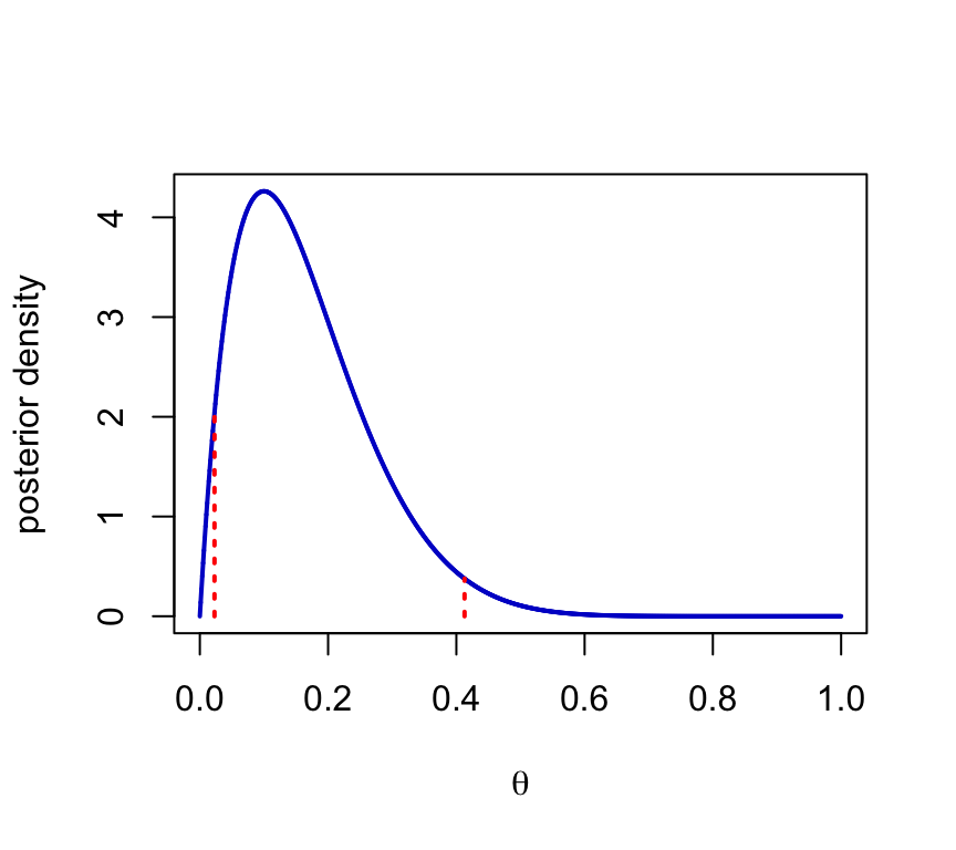To make a \(100 \times (1-\alpha)%\) equi-tail quantile-based credible interval, find numbers (quantiles) \(\theta_{\alpha/2} < \theta_{1-\alpha/2}\) such that