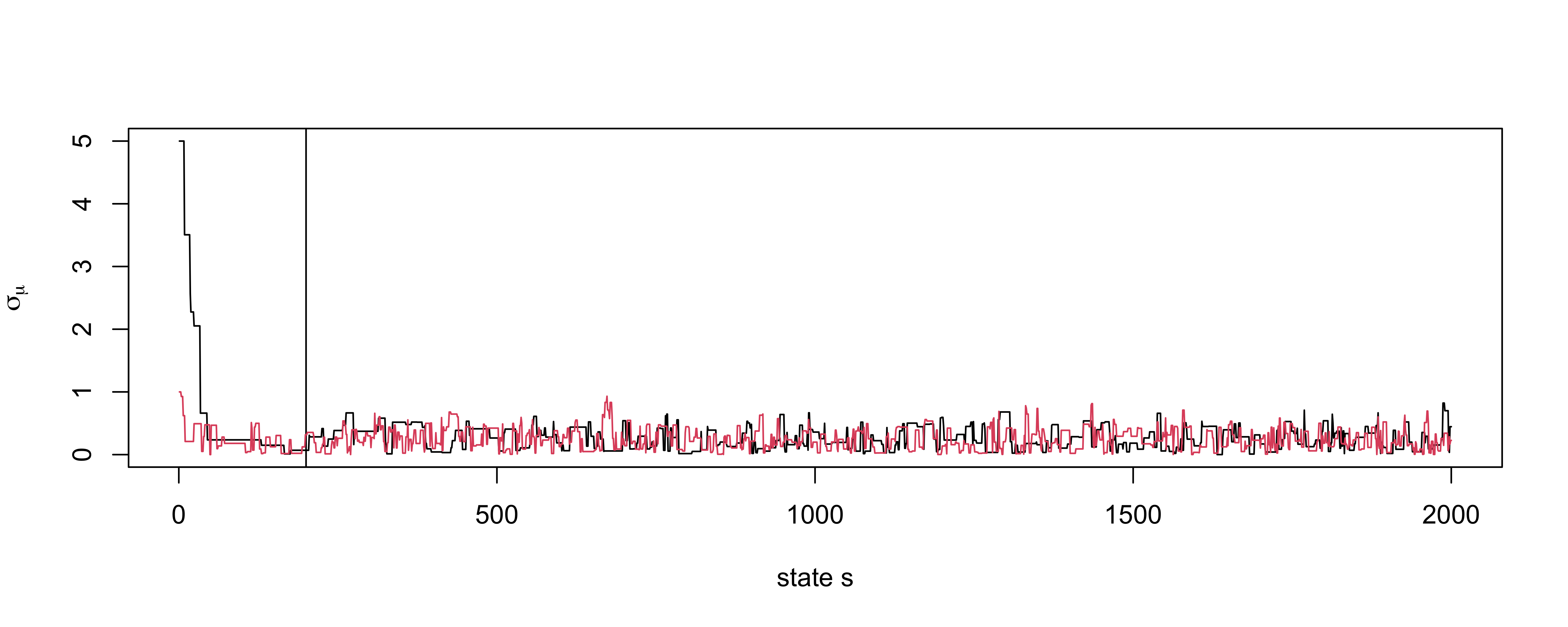 proposal for \(s > s_0\) with \(\delta = 2.38/\sqrt{d}\) \[\theta^* \sim \textsf{N}(\theta^{(s)}, \delta^2 (\Sigma^{(s)} + \epsilon I_d))\]