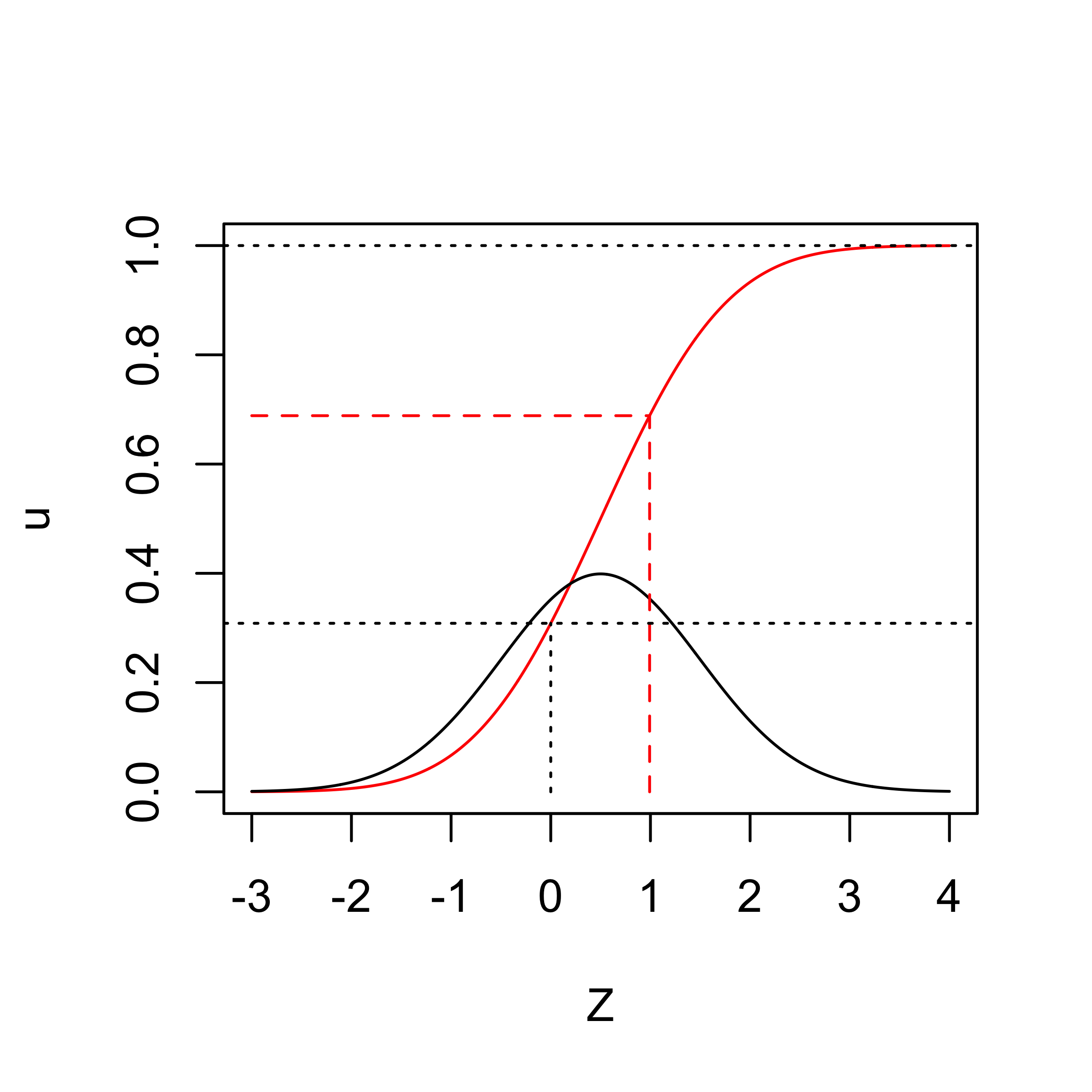 Relationship to probit model: \[\begin{align*}\Pr(y = 1 \mid \beta) & = P(Z_i > 0 \mid \beta) \\ & = P(Z_i - x_i^T \beta > -x^T\beta) \\ & = P(\epsilon_i > -x^T\beta) \\ & = 1 - \Phi(-x^T_i \beta) \\ & = \Phi(x^T_i \beta) \end{align*}\]
