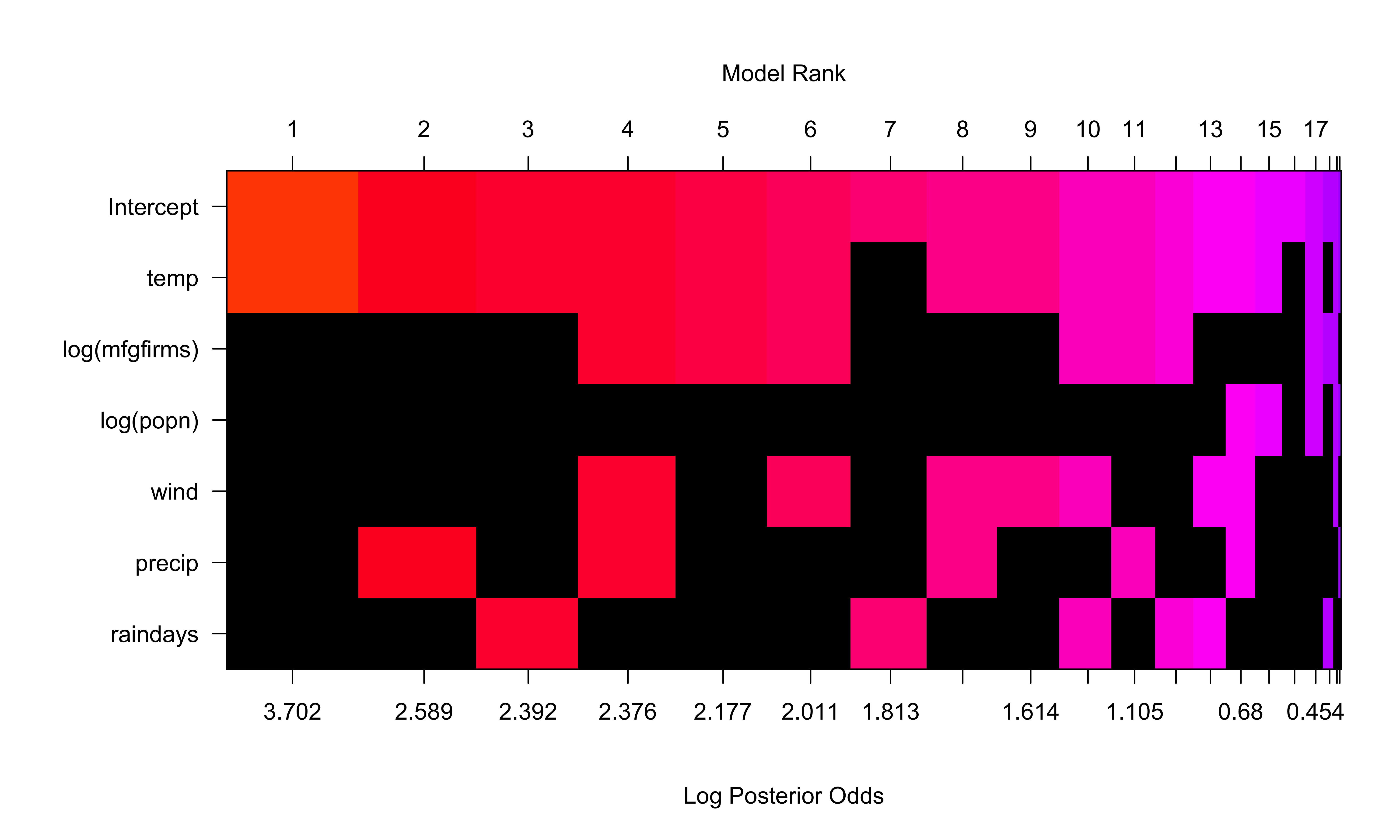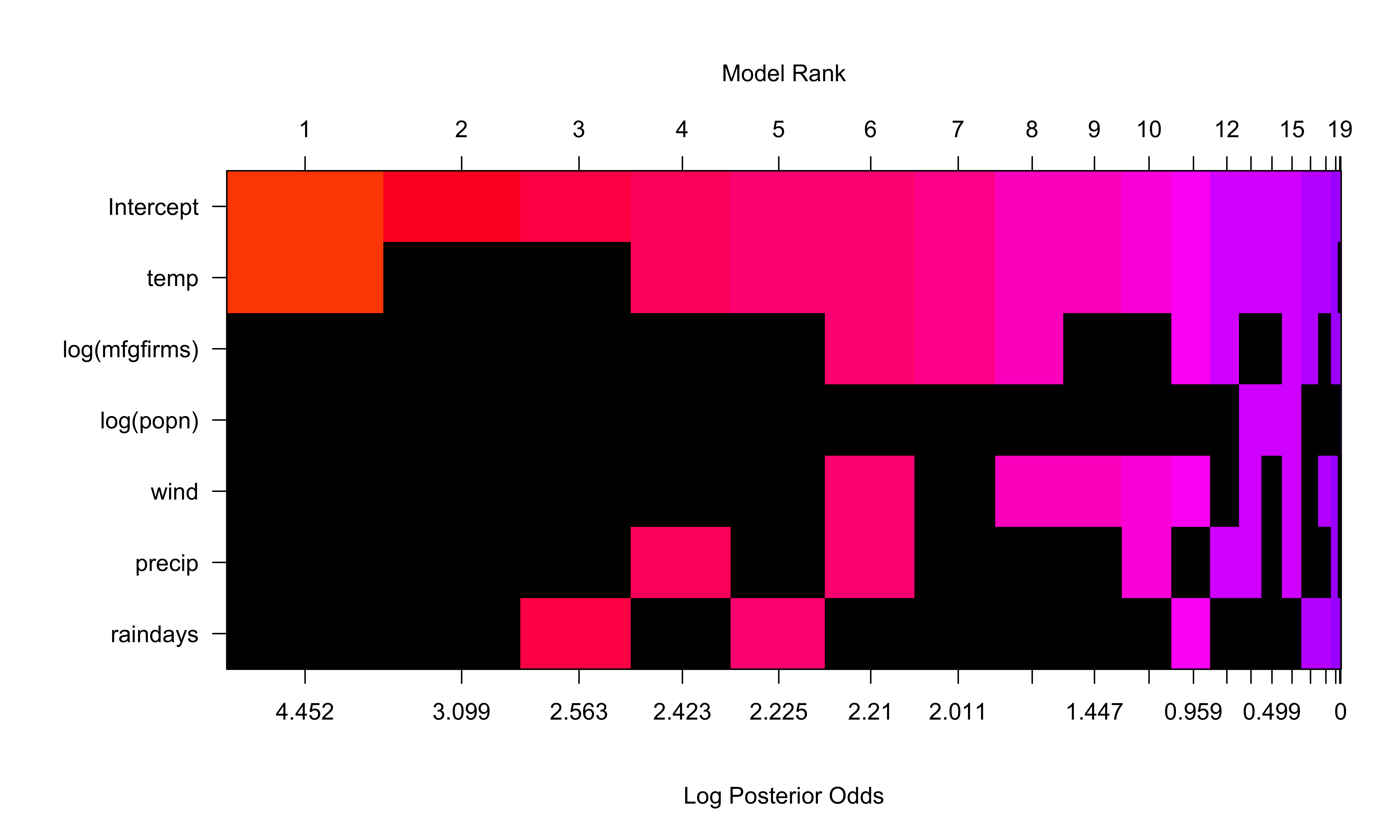 The Bayes factor for comparing \(\boldsymbol{\gamma}\) to the null model: \[ BF(\boldsymbol{\gamma}: \boldsymbol{\gamma}_0) = (1 + g)^{(n - 1 - p_{\boldsymbol{\gamma}})/2} (1 + g(1 - R_{\boldsymbol{\gamma}}^2))^{-(n-1)/2} \]
