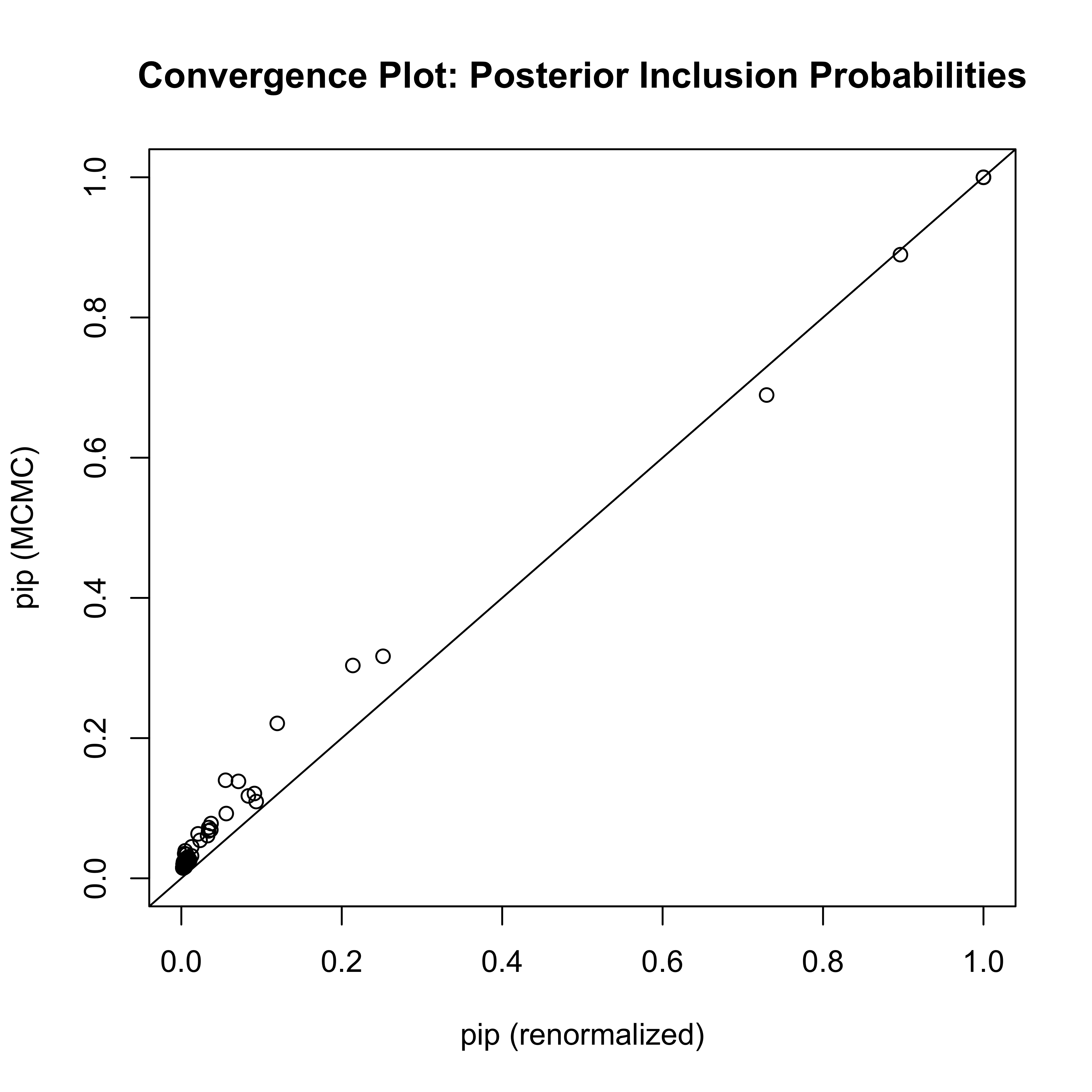 • renormalized posterior probabilities \(\hat{P}_{RN}(\boldsymbol{\gamma}\mid \mathbf{Y}) = \frac{p(\mathbf{Y}\mid \boldsymbol{\gamma}) p(\boldsymbol{\gamma})} {\sum_{\boldsymbol{\gamma}\in S} p(\mathbf{Y}\mid \boldsymbol{\gamma}) p(\boldsymbol{\gamma})}\)