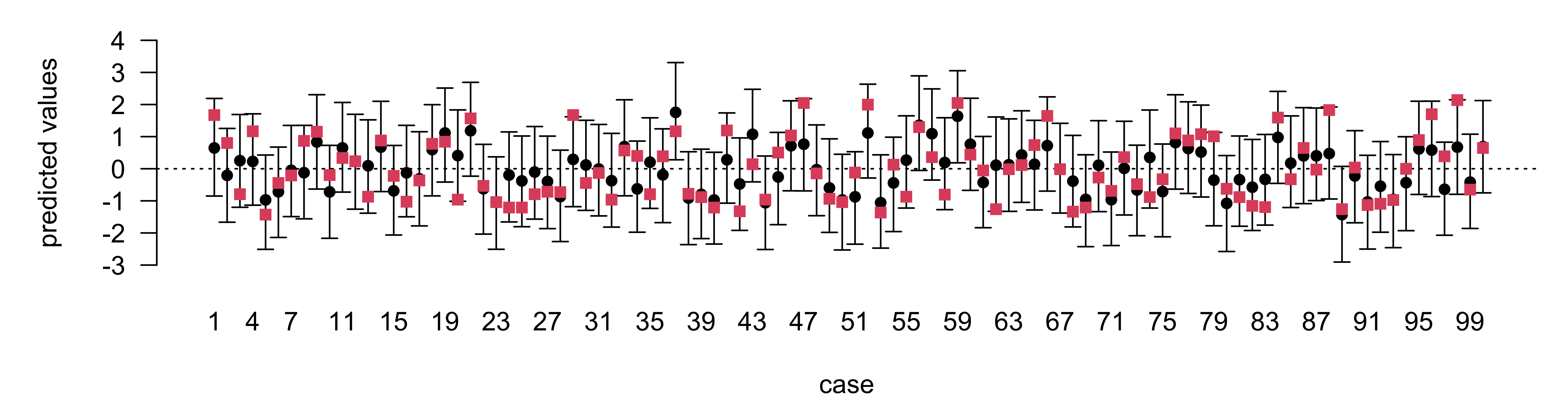 • Prediction under model averaging \[\hat{Y} = \sum_S (\hat{\alpha}_\boldsymbol{\gamma}+ \mathbf{X}_{\boldsymbol{\gamma}}^{\text{test}} \hat{\boldsymbol{\beta}}_{\boldsymbol{\gamma}}) \hat{p}(\boldsymbol{\gamma}\mid \mathbf{Y})\]