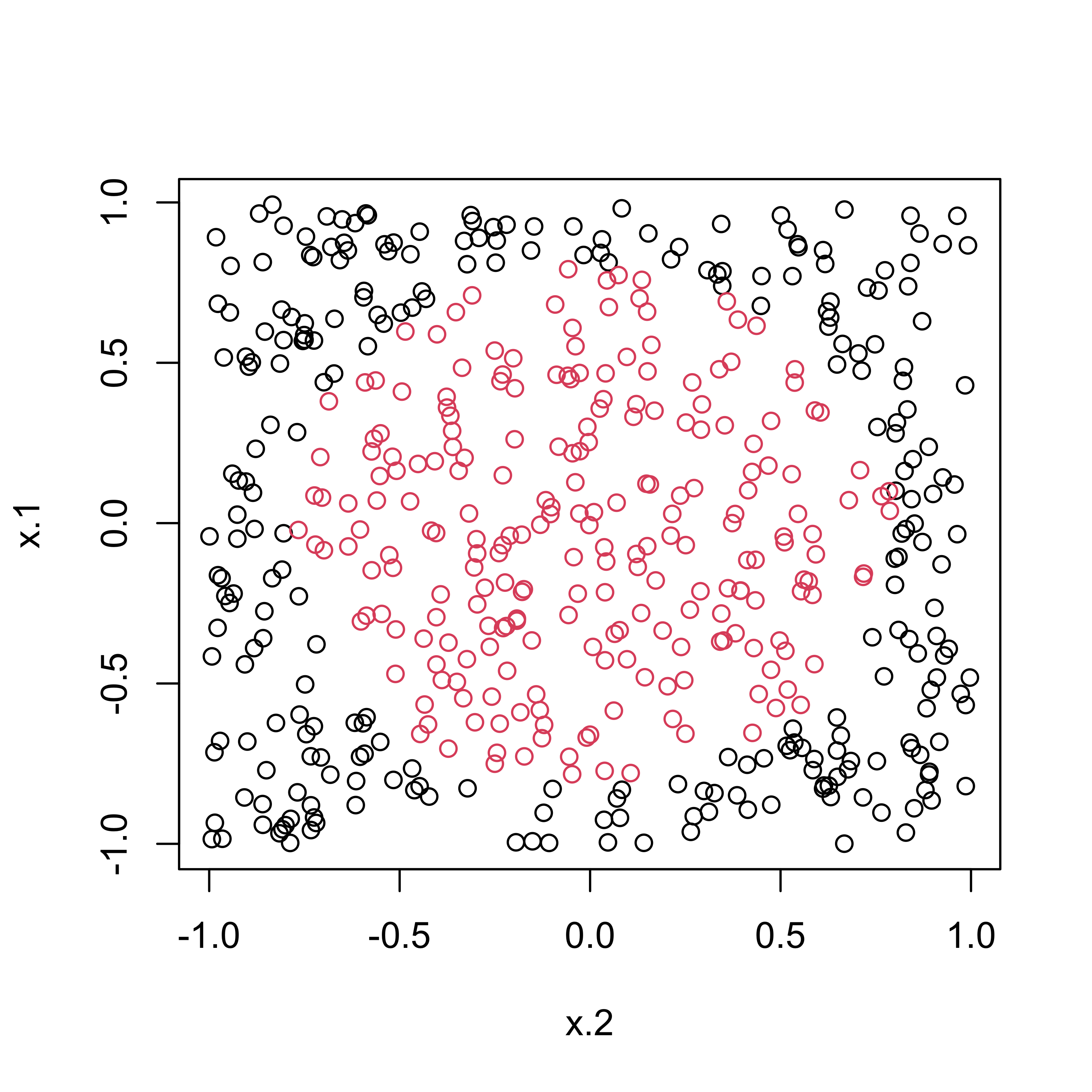 circle2.svm = svm(y ~ x.1 + x.2, data=circle2[train,],